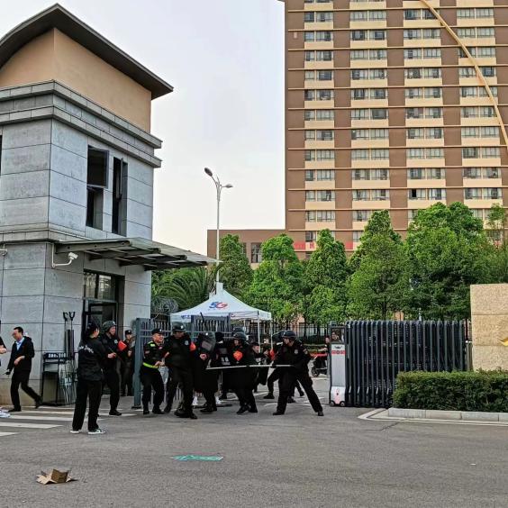 第四個(gè)科目門崗反恐處突演練。5名暴恐分子扮演者在門口躍躍欲試,暴力沖擊門崗,按照學(xué)校突發(fā)事件處置預(yù)案和流程,緊急啟動(dòng)預(yù)案、分級(jí)處置、梯隊(duì)增援、分頭報(bào)告,采取公開(kāi)警告、防爆隊(duì)形包圍、現(xiàn)場(chǎng)擒獲制服等措施成功處置,鍛煉了隊(duì)伍,積累了處置經(jīng)驗(yàn)。