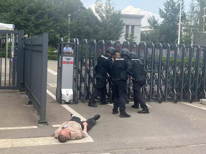 科目四是最小作戰(zhàn)單元(三人組)實(shí)操演練。1名暴恐分子在門口挾持人質(zhì),暴力沖擊門崗,安保人員以3人為一個(gè)處置單元,制服“嫌疑人”,速戰(zhàn)速?zèng)Q。