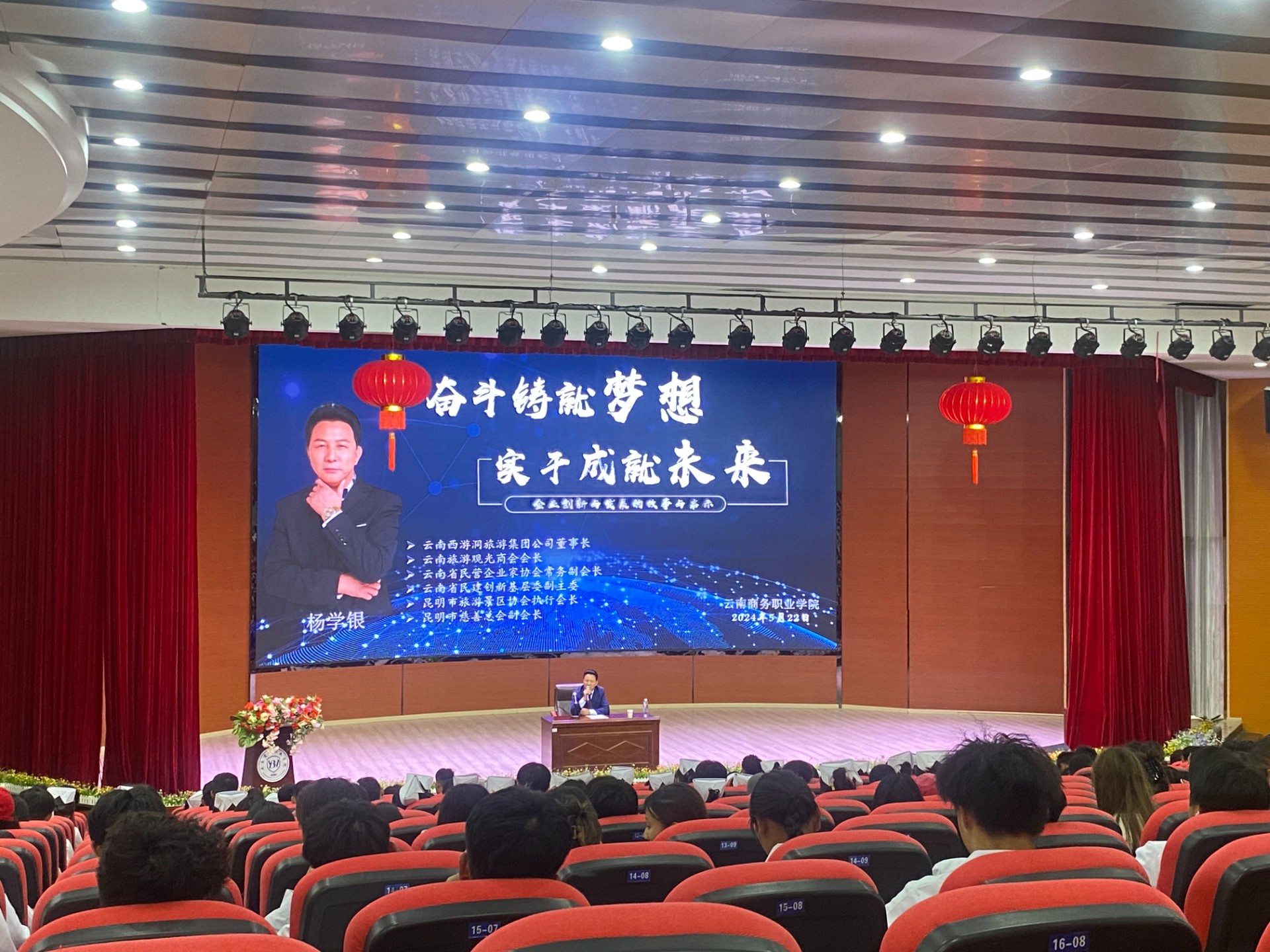 2024年5月22日,云南西游洞旅游集團(tuán)公司董事長楊學(xué)銀到我校開展宣講,向在場的師生分享了企業(yè)創(chuàng)新與發(fā)展的故事。師生們反響熱烈,在此次宣講會(huì)中收獲頗多。
