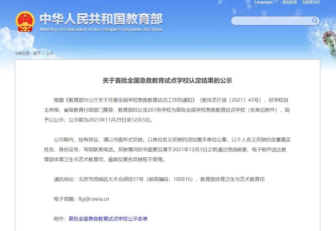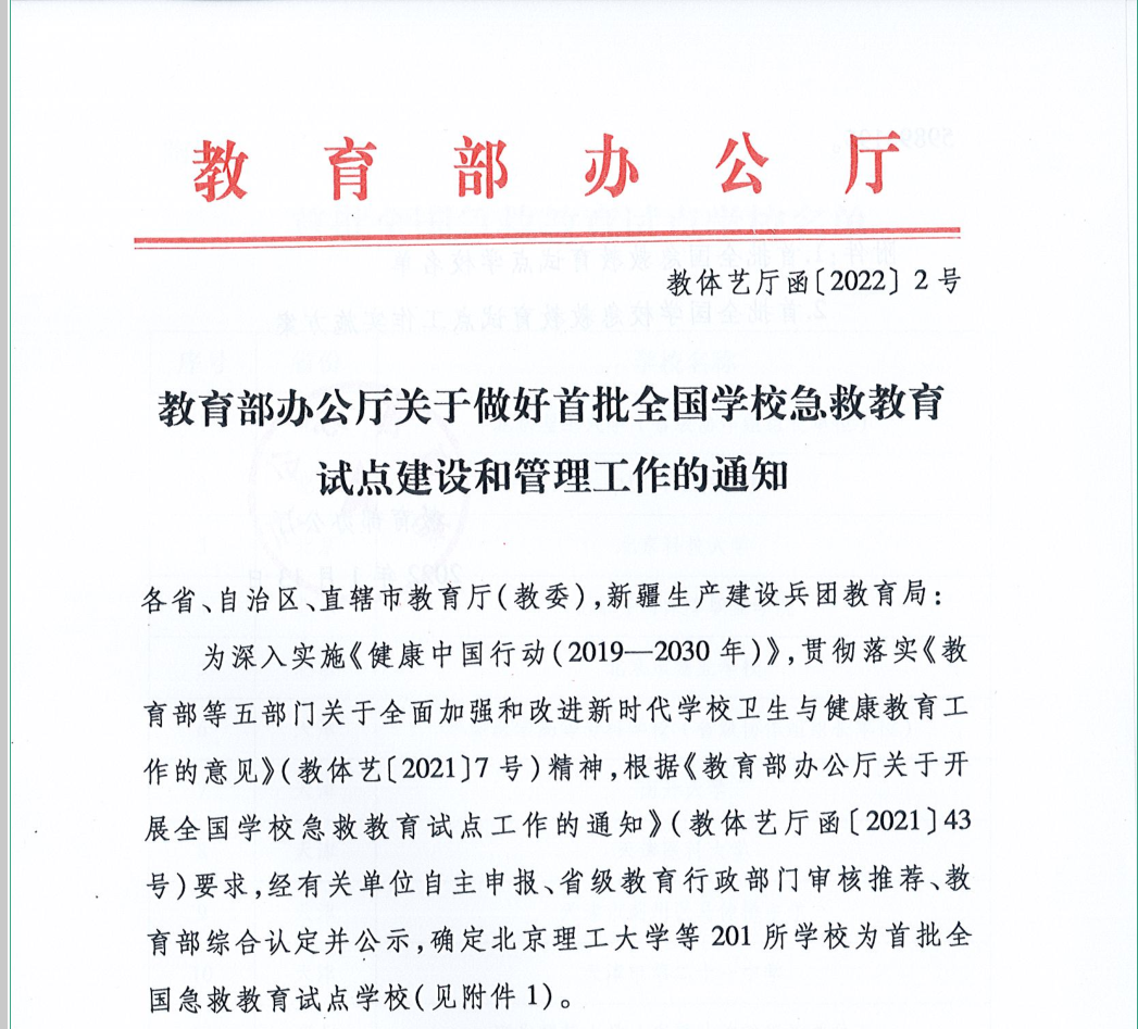 為深入實施《健康中國行動(2019-2030年)》,貫徹落實《教育部等五部門關(guān)于全面加強(qiáng)和改進(jìn)新時代學(xué)校衛(wèi)生與健康教育工作的意見》精神,2021年10月,教育部下發(fā)《教育部辦公廳關(guān)于開展全國學(xué)校急救教育試點工作的通知》,決定實施青少年急救教育行動計劃,開展全國學(xué)校急救教育試點工作。該項試點工作以提升學(xué)生健康素養(yǎng)為核心,以普及急救知識和技能為重點,以提高校園應(yīng)急救護(hù)能力為目標(biāo)。試點建設(shè)任務(wù)包括:普及校園急救知識、配備校園急救設(shè)施、開展應(yīng)急救護(hù)培訓(xùn)等。經(jīng)學(xué)校自主申報、省級教育行政部門審核推薦,教育部綜合認(rèn)定并公示,確定201所學(xué)校為首批全國急救教育試點學(xué)校。