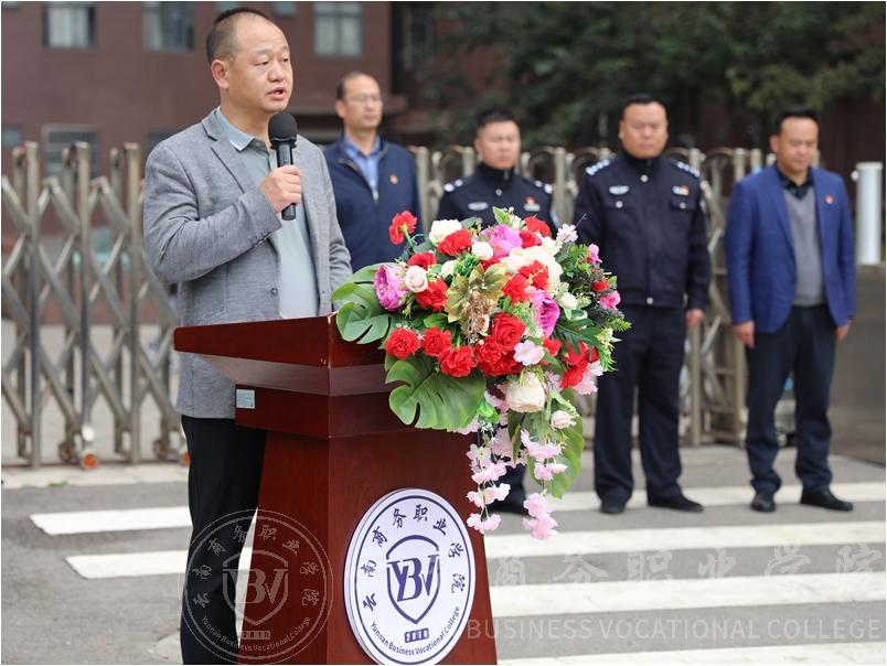 副校長武紹宏在儀式上致辭,向龍保派出所長期給予云商安全、法治工作的指導(dǎo)、幫助和支持表示誠摯的感謝!對蒞臨儀式現(xiàn)場的李曉明副所長、楊志剛警官表示熱烈的歡迎!他強調(diào),“校園110”揭牌儀式標(biāo)志著云商在壓降警情、法治教育、安全管理、維護師生權(quán)益、確保校園安全等安全管理方面邁出了堅實的一步,并對抓好、抓實壓降警情及安全管理提出相關(guān)要求,再加強宣傳、再加強管理、再加強聯(lián)動。