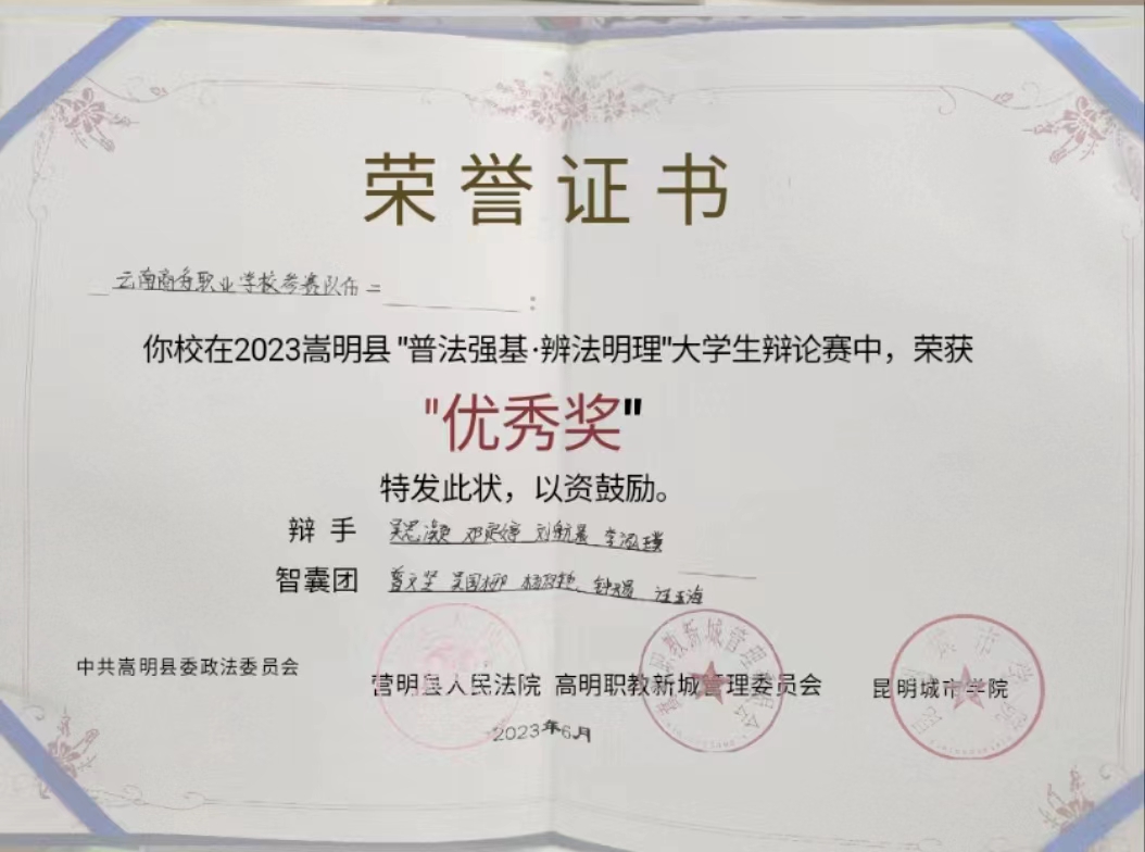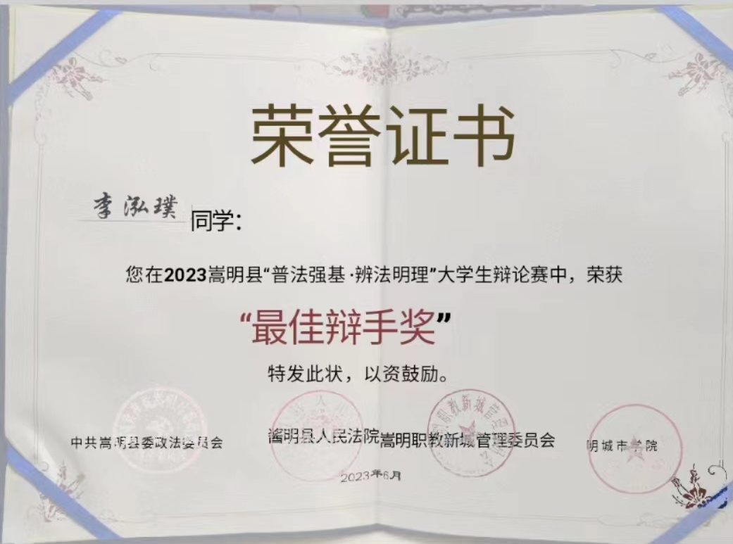 4.2023嵩明縣“普法強(qiáng)基·辨法明理”大學(xué)生辯論賽中,榮獲“最佳辯手獎(jiǎng)”4項(xiàng);